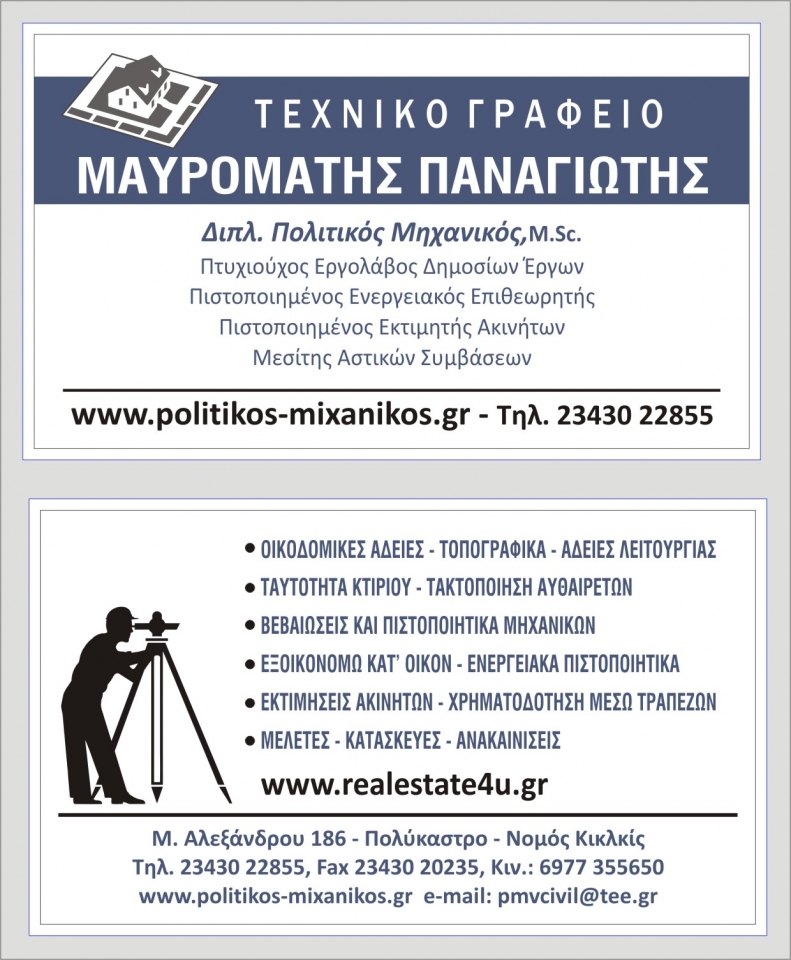 customer tabsΕπικοινωνίαΤεχνικό γραφείοΠολιτικός Μηχανικός MScΤοπογράφοςΠιστοποιημένος ενεργειακός επιθεωρητήςΠτυχιούχος εργολάβος δημόσιων έργωνΝομιμοποιήσεις αυθαίρετωνΕνεργειακά πιστοποιητικάΤεχνικά Γραφεία και ΕταιρείεςΠολιτικοί ΜηχανικοίΑγρονόμοι - ΤοπογράφοιΕνεργειακοί ΕπιθεωρητέςΜεσιτικά Γραφεία - ΚτηματομεσίτεςΔόμηση - ΚατοικίαΥπηρεσίεςΜεγάλου Αλεξάνδρου 186, Πολύκαστρο, ΚιλκίςΠΟΛΥΚΑΣΤΡΟ ΚΙΛΚΙΣΚΙΛΚΙΣΜΑΚΕΔΟΝΙΑ 2343022855 69773556502343020235pmvcivil@tee.grinfo@politikos-mixanikos.grrealestate.mixanikoi@gmail.compolitikos-mixanikos.grwww.realestate4u.grΜεσιτική-Κατασκευαστική Μαυρομάτης Το προτείνω (έχει προταθεί 2 φορές) ΦωτογραφίεςFacebook LikeShare on FacebookTweet Widget
